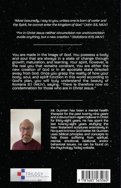 "Most assuredly, I say to you, unless one is born of water and the Spirit, he cannot enter the kingdom of God." (John 3:5, NKJV) "For in Christ Jesus neither circumcision nor uncircumcision avails anything, but a new creation." (Galatians 6:15, NKJV) You are made in the image of God. You possess a body and soul that are always in a state of change through growth, maturation, and learning. Your spirit, however, is the real you that remains constant. You are either the new creation of God or in an apostate state directed away fro God. Once you grasp the reality of how your body, soul, and spirit function in this world according to God's plan, you will truly understand the beauty of Romans 8:1 (NKJV), saying " There is therefore now no condemnation for those who are in Christ Jesus."