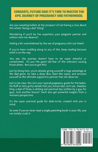 Congrats, Future Dad! It's Time to Master the Epic Journey of Pregnancy and Fatherhood! Are you sweating bullets at the prospect of not having a clue about this whole "being a dad" thing? Wondering if you'll be the superhero your pregnant partner and unborn mini-me deserve? Feeling a bit overwhelmed by the sea of pregnancy info out there? If you've been nodding along to any of this, keep those eyes glued to the screen because relief is on the way. You see, this journey doesn't have to be super stressful or complicated. It's just the good old fear of the unknown causing those jitters. But you've got this! Just by being here, you're already giving yourself a huge advantage at the dad game. So take a deep dive, learn the ropes, and envision yourself as the ultimate supportive partner that she deserves. In This Super Practical Guide, You'll Discover:How to Master the Pregnancy Journey: Learn the Juicy Secrets That'll Have Your Partner Raving About Your Amazing Dad-to-Be Skills. Supportive Techniques and Tools: Uncover Must-have Techniques and Tools Your Partner Will Absolutely Adore for a Smoother Journey. The Happy Relationship Blueprint: Discover the Keys to a Happy Relationship, Including Tips for Planning the Perfect Babymoon and Keeping the Romance Alive and Well. 5 Super Easy Tips for Mastering Parenthood as a Team! How to Survive Her Pregnancy Symptoms: Tackle Wild Cravings and Hormone Surges with Essential Strategies to Keep Your Sanity Intact! Pro Tips for New Dads: Super Practical Advice to Make You Look Like a Pregnancy Pro Right From the Start. Babyproofing 101: 15 Easy and Incredibly Effective Tips & Hacks to Keep Your Baby Safe. How to Master the Social Scene with Confidence: 7 Simple, Yet Wildly Effective Tactics to Handle Unwanted Pregnancy and Baby Advice! How to Prepare for D-Day: Transform into a Superhero with Practical Tips and Navigate with Confidence! The First 48 Hours Survival Guide: Brace Yourself for This Super Chaotic Time with Insider Tips on What to Expect. It Gets Real, and We've Got You Covered. Powerful insights from a woman's perspective because we're not mind readers. And so much more... INCLUDED: BONUS #1: Survival Checklists - Your Key to Staying Organized and Making the Pregnancy Journey Super Smooth! BONUS #2: Mental Wellness Guide for Dads (e-book): Your Indispensable Guide to Self-care and Self-discovery, Ensuring a Journey Towards a Happier and More Fulfilled You! BONUS #3: Meditation Audio for Dads - Your Instant Escape to Calmness, Relaxation, and Well-deserved Quality "Me Time". Yes, You're Going to Need This! Just to be clear, this isn't your typical pregnancy guide for the ladies. No fluff or nitty gritty details that you, future dad, can't use. Maddox King, a dad of three, is dishing out practical tips written by a guy, for guys. It's the super practical guide for dads-to-be, created with you in mind. So even if you've never read a single parenting book in your life, you can totally crush it. Ready to Be the Ultimate Supportive Partner and Master the Pregnancy Journey? Well, Don't Hesitate! Level Up Your Game and Hit that "Add to Cart" Button Like Right Now.