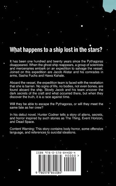 It has been one hundred and twenty years since the Pythagoras disappeared. When the ghost ship reappears, a group of scientists and mercenaries embark on an expedition to salvage the vessel. Joined on this expedition is Jacob Alistar and his comrades in arms, Sasha Fuchs and Hawa Kahale. Aboard the vessel, the expedition team is faced with the revelation that she is barren. No signs of life, no bodies, not even bones, are found aboard the ship. Slowly Jacob and his team uncover the dark secrets of the craft and what occurred there, but when they discover the truth, it is a race against time. Will they be able to escape the Pythagoras, or will they meet the same fate as her crew? In his debut novel, Hunter Codner tells a story of aliens, secrets, and horror inspired by such stories as The Thing, Event Horizon, and Dead Space. Author's Note: This story contains body horror, some offensive language, and references to suicidal ideations.