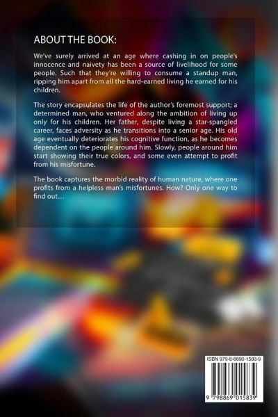 We've surely arrived at an age where cashing in on people's innocence and naivety has been a source of livelihood for some people. Such that they're willing to consume a standup man, ripping him apart from all the hard-earned living he earned for his children. The story encapsulates the life of the author's foremost support; a determined man, who ventured along the ambition of living up only for his children. Her father, despite living a star-spangled career, faces adversity as he transitions into a senior age. His old age eventually deteriorates his cognitive function, as he becomes dependent on the people around him. Slowly, people around him start showing their true colors, and some even attempt to profit from his misfortune. The book captures the morbid reality of human nature, where one profits from a helpless man's misfortunes. How? Only one way to find out...