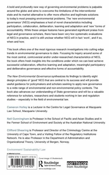 A bold and profoundly new way of governing environmental problems is palpable around the globe and aims to overcome the limitations of the interventionist state and its market alternative to offer more effective and legitimate solutions to today's most pressing environmental problems. The 'new environmental governance' (NEG) emphasises a host of novel characteristics including participation, collaboration, deliberation, learning and adaptation and 'new' forms of accountability. While these unique features have generated significant praise from legal and governance scholars, there have been very few systematic evaluations of NEG in practice, and it is still unclear whether NEG will in fact 'work', and if so, when and how. This book offers one of the most rigorous research investigations into cutting edge trends in environmental governance to date. Focusing its inquiry around some of the most central, controversial and/or under researched characteristics of NEG, the book offers fresh insights into the conditions under which we can best achieve successful collaboration, effective learning and adaptation, meaningful participatory and deliberative governance and effective forms of accountability. The book synthesizes its findings to identify seven key pillars of 'good' NEG that are central to its success and will provide useful guidance for policymakers and scholars seeking to apply new governance to a wide range of environmental and non-environmental policy contexts. The book also advances our understanding of State governance and will be a valuable reference for scholars, researchers and students working in law and regulation studies - especially in the field of environmental law.