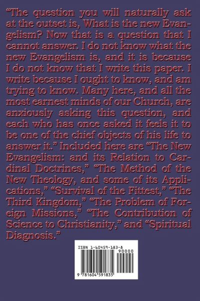"The question you will naturally ask at the outset is, "What is the new Evangelism?" Now that is a question that I cannot answer. I do not know what the new Evangelism is, and it is because I do not know that I write this paper. I write because I ought to know, and am trying to know. Many here, and all the most earnest minds of our Church, are anxiously asking this question, and each who has once asked it feels it to be one of the chief objects of his life to answer it." Included here are "The New Evangelism: and its Relation to Cardinal Doctrines," "The Method of the New Theology, and some of its Applications," "Survival of the Fittest," "The Third Kingdom," "The Problem of Foreign Missions," "The Contribution of Science to Christianity," and "Spiritual Diagnosis."