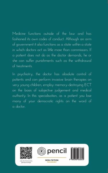 Medicine functions outside of the law and has fashioned its own codes of conduct. Although an arm of government it also functions as a state within a state in which doctors act as little more than commissars. If a patient does not do as the doctor demands, he or she can suffer punishments such as the withdrawal of treatments. In psychiatry, the doctor has absolute control of patients and can perform invasive brain therapies on very young children, employ memory-destroying ECT on the basis of subjective judgement and medical authority. In this specialisation, as a patient you lose many of your democratic rights on the word of a doctor.