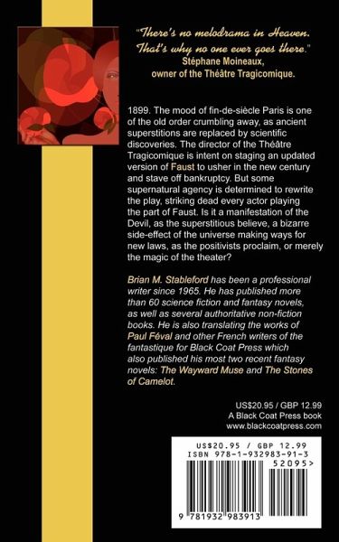 1899. The mood of fin-de-siècle Paris is one of the old order crumbling away, as ancient superstitions are replaced by scientific discoveries. The director of the Théâtre Tragicomique is intent on staging an updated version of Faust to usher in the new century -- and stave off bankruptcy. But some supernatural agency is determined to rewrite the play, striking dead every actor playing the part of Faust. Is it a manifestation of the Devil, as the superstitious believe, a bizarre side-effect of the universe making ways for new laws, as the positivists proclaim, or merely the magic of the theater? Brian M. Stableford has been a professional writer since 1965. He has published more than 60 science fiction and fantasy novels, as well as several authoritative non-fiction books. He is also translating the works of Paul Féval and other French writers of the fantastique for Black Coat Press which also published his most two recent fantasy novels: The Wayward Muse and The Stones of Camelot.