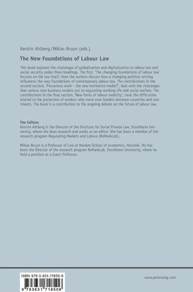 This book explores the challenges of globalisation and digitalisation to labour law and social security under three headings. The first, «The changing foundations of labour law» focuses on the law itself. Here the authors discuss how a changing political setting influences the very foundations of contemporary labour law. The contributions in the second section, «Precarious work - the new normative model?», deal with the challenges that various new business models put to regulating working life and social welfare. The contributions in the final section, «New forms of labour mobility», treat the difficulties related to the protection of workers who move over borders between countries and continents. The book is a contribution to the ongoing debate on the future of labour law.