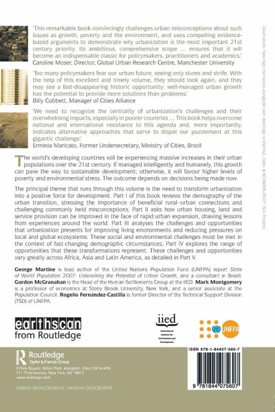 George Martine is lead author of the United Nations Population Fund (UNFPA) report State of World Population 2007: Unleashing the Potential of Urban Growth, and a consultant in Brazil. Gordon McGranahan is the Head of the Human Settlements Group at the IIED. Mark Montgomery is a professor of economics at Stony Brook University, New York, and a senior associate at the Population Council. Rogelio Fernandez-Castilla is former Director of the Technical Support Division (TSD) of UNFPA.