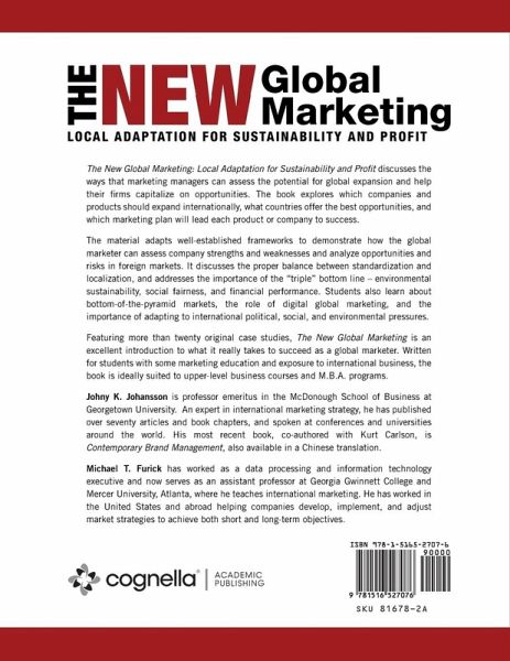 The New Global Marketing: Local Adaptation for Sustainability and Profit discusses the ways that marketing managers can assess the potential for global expansion and help their firms capitalize on opportunities. The book explores which companies and products should expand internationally, what countries offer the best opportunities, and which marketing plan will lead each product or company to success. The material adapts well-established frameworks to demonstrate how the global marketer can assess company strengths and weaknesses and analyze opportunities and risks in foreign markets. It discusses the proper balance between standardization and localization, and addresses the importance of the "triple" bottom line - environmental sustainability, social fairness, and financial performance. Students also learn about bottom-of-the-pyramid markets, the role of digital global marketing, and the importance of adapting to international political, social, and environmental pressures. Featuring more than twenty original case studies, The New Global Marketing is an excellent introduction to what it really takes to succeed as a global marketer. Written for students with some marketing education and exposure to international business, the book is ideally suited to upper-level business courses and M.B.A. programs. Johny K. Johansson is professor emeritus in the McDonough School of Business at Georgetown University. An expert in international marketing strategy, he has published over seventy articles and book chapters, and spoken at conferences and universities around the world. His most recent book, co-authored with Kurt Carlson, is Contemporary Brand Management, also available in a Chinese translation. Michael T. Furick has worked as a data processing and information technology executive, as an assistant professor of international marketing at Georgia Gwinnett College, and as a faculty member at Mercer University Atlanta. He has worked in the United States and abroad helping companies develop, implement, and adjust market strategies to achieve both short and long-term objectives.