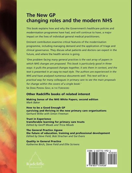 This book explains how and why the Government's healthcare policies and modernisation programme have had, and will continue to have, a major impact on the lives of individual general medical practitioners. Eminent contributors examine critical features of the modernisation programme, including managing demand, the application of triage and clinical governance, and discuss what patients and doctors can expect in the future, and where the health service is going.