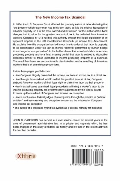 As a long-standing annual reality, Americans have come to view April 15 for one particular unpleasant significance - the legal deadline to file their income tax returns - unless, of course, they are in the ranks of those malcontents who defiantly refuse to fulfill this obligation. Like most of us, citizen tax reformer, J. Christopher Garrison avoids such self-defeating tactics and pays due respect to all aspects of current tax law. Nonetheless, fearlessly exercising his right to free speech, in his book, The New Income Tax Scandal, Garrison lays bare and denounces the shocking truth about the way the IRS has classified American workers under income tax law. Armed with a comprehensive body of evidence, Garrison filed suit against the IRS, determined to raise the issue before federal courts. His book documents the issue and the litigation that ensued. This is the story of Garrison's futile and exasperating attempt to right a wrong. The fact that the outcome was cynically predetermined by the government to fail, makes Garrison's documented account interesting reading. Hence, and not surprising, the attempt unearthed a trail of deceit, distortion, and hypocrisy perpetrated by those in government sworn to serve the people. Anticipate a sense of outrage when you witness how the courts stonewalled Garrison and suppressed his evidence, when you witness the courts' duplicitous interpretation of constitutional law, when you come face to face with the horrifying realization that all this was to cover up the truth that working Americans have been classified by the IRS in the same manner American slaves were classified - beings who have no right to claim their bodily labor as their property. Garrison cites State and Federal court cases (including U.S. Supreme Court) that have confirmed the legal standing of bodily labor as a worker's property, Constitutionally protected under the Fifth Amendment. Finally, Garrison outlines a new tax system that he believes will remedy the problem he addresses.