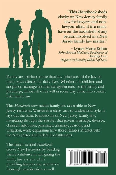 "This Handbook sheds clarity on New Jersey family law for lawyers and non-lawyers alike. It is a must-have on the bookshelf of any person involved in a New Jersey family law matter." - Lynne Marie Kohm Professor of Family Law Regent University School of Law Family law, perhaps more than any other area of the law, in many ways affects our daily lives. Whether it is children and adoption, marriage and marital agreements, or the family and parentage, almost all of us will in some way come into contact with family law. Written in a clear, easy to understand style, this Handbook lays out the basic foundations of New Jersey family law, navigating through the statutes that govern the following subjects: ¿ Marriage and marital contracts; ¿ Children and adoption; ¿ The family and divorce; ¿ Alimony and child support; ¿ Domestic violence; ¿ The family and parentage; ¿ Abortion and assisted reproductive technology; ¿ Children, custody, and visitation.