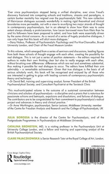 Editors' Introduction: The new dialogues: Freud Klein Lacan Part I An introduction to Melanie Klein's ideas An introduction to Lacan Part II Klein-Lacan: ego The ego according to Klein: return to Freud and beyond The ego and the other in Lacan's return to Freud Part III The object The object: a Kleinian view The object in Klein and Lacan Part IV Klein-Lacan: the body Corporeality and unconscious phantasy: the role of the body in Kleinian theory Lacan on the body Part V Klein-Lacan: trauma Trauma in Kleinian psychoanalysis Trauma Part VI Affects Affects in Melanie Klein Passion: a Lacanian reading of Freud's "affect" Part VII Autism A Kleinian approach to the treatment of children with autism Lacan and autism Part VIII The Symbolic Symbolism emotions and mental growth Symbolic functioning Part IX Why Klein-Lacan dialogue is difficult History archives; Freud Lacan *