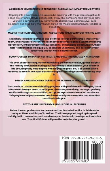 Accelerate Your Leadership Transition and Make an Impact from Day One Stepping into a new leadership role can be daunting, with the pressure to get up to speed quickly and catalyze change right away. This comprehensive playbook arms you with a powerful 90-day framework to shorten your learning curve, build credibility, and drive early momentum during the most crucial window for leaders in transition. Master the Strategies, Mindsets, and Actions to Excel in Your First 90 Days Learn how to balance patience and boldness to forge partnerships, inspire your team, and engineer coherent moves that validate your agenda. Whether tackling a promotion, onboarding into a new company, or managing an acquisition, these field-tested tactics will equip you to conquer uncertainty and accelerate your leadership impact when it matters most. Equip Yourself to Rapidly Get Results and Build Influence as a New Leader This book shares techniques to methodically build relationships, gather insights, and identify dysfunction during your first 30 days. Then channel your influence into securing early wins aligned with long-term goals. You'll be armed with a roadmap to excel in new roles by shortening your learning curve and earning buy-in. Drive Change Smoothly During Your Transition into Leadership Discover how to balance celebrating progress with persistence in reshaping team culture over 90 days. Learn to anticipate obstacles proactively, manage up wisely, motivate through accountability, and optimize processes to embed excellence. This playbook helps you master crucial leadership conversations and smoothly transition into impact. Set Yourself Up for Enduring Success in Leadership Follow the comprehensive framework and battle-tested tactics in this book to conquer the uncertainty of transition. You'll be equipped to get up to speed quickly, build momentum, and accelerate your leadership development from day one. Your first 90 days will pave the trajectory for growth.