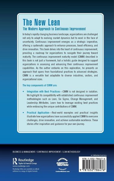 In today's rapidly changing business landscape, organizations are challenged not only to adapt to evolving market dynamics but to excel in the face of uncertainty. Continuous improvement emerges as a strategic imperative, offering a systematic approach to enhance processes, boost efficiency, and drive innovation. This book delves into the heart of continuous improvement, providing a roadmap for organizations to navigate their journey toward maturity. The continuous improvement maturity model (CIMM) described in this book is not just a framework, but a holistic guide designed to support organizations in assessing and advancing their continuous improvement capabilities. As the author embarks on this exploration, he presents an approach that spans from foundational practices to advanced strategies. CIMM is a versatile tool adaptable to diverse industries, sectors, and organizational sizes.