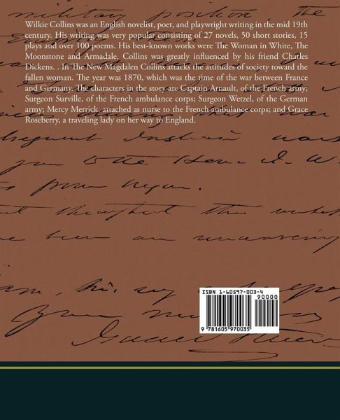 Wilkie Collins was an English novelist, poet, and playwright writing in the mid 19th century. His writing was very popular consisting of 27 novels, 50 short stories, 15 plays and over 100 poems. His best-known works were The Woman in White, The Moonstone and Armadale. Collins was greatly influenced by his friend Charles Dickens. . In The New Magdalen Collins attacks the attitudes of society toward the fallen woman. The year was 1870, which was the time of the war between France and Germany. The characters in the story are Captain Arnault, of the French army; Surgeon Surville, of the French ambulance corps; Surgeon Wetzel, of the German army; Mercy Merrick, attached as nurse to the French ambulance corps; and Grace Roseberry, a traveling lady on her way to England.