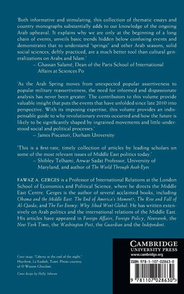 1. Introduction: a rupture Fawaz A. Gerges; Part I. Context and Clauses: 2. Authoritarian legacies and regime change: towards understanding political transition in the Arab world Lisa Anderson; 3. Egypt's modern revolutions and the fall of Mubarak Juan Cole; 4. A depressive pre-Arab uprising economic performance Ali Kadri; 5. Bread and olive oil: the agrarian roots of the Arab uprisings Rami Zurayk and Anne Gough; Part II. Thematic and Comparative Aspects: 6. The politics of resistance and the Arab uprisings Charles Tripp; 7. Egypt's 25 January uprising, hegemonic contestation and the explosion of the poor John Chalcraft; 8. The military amidst uprisings and transitions in the Arab world Philippe Droz-Vincent; 9. Women, democracy and dictatorship in the context of the Arab uprisings Sami Zubaida; 10. Dangers and demon(izer)s of democratization in Egypt: through an Indonesian glass, darkly John Sidel; Part III. Countries in Turmoil: 11. Egypt and Tunisia in the Arab Spring: from the revolutionary overthrow of dictatorships to the struggle to establish a new constitutional order Roger Owen; 12. Arab nationalism, Islamism and the Arab uprisings Sadik Al-Azm; 13. Yemen: revolution suspended? Gabriele Vom Bruck, Atiaf al-Wazir and Benjamin Wiacek; 14. Libya in transition: from Jamahiriya to Jumh¿riyyah? Karim Mezran; 15. Bahrain's uprisings: domestic implications and regional and international perspectives Kristian Ulrichsen; Part IV. International Implications: 16. Saudi internal dilemmas and regional responses to the Arab uprisings Madawi Al-Rasheed; 17. Israel, Palestine and the Arab Spring Avi Shlaim; 18. Turkey and Iran in the era of the Arab uprisings Mohammed Ayoob; 19. US policy and the Arab revolutions of 2011 William Quandt; 20. Europe and the Arab uprisings: the irrelevant power? Federica Bicchi; 21. Conclusion: rebellious citizens and resilient authoritarians Valerie Bunce.