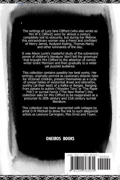 The writings of Lucy lane Clifford (who also wrote as Mrs W K Clifford) were for almost a century completely lost to obscurity, but during her lifetime this extraordinary woman was a friend and confidant of Henry James, Rudyard Kipling, Thomas Hardy and other luminaries of the day. This collection contains possibly her best works. Her writings, originally penned as cautionary didactic tales for Victorian children, present themselves as a cycle of unique fables of existential dread and alienation, worthy (at their best) of a Kafka or Borges. Ranging from paeans to autism ('Wooden Tony' or 'The Paper Fish') or surreal horror ('The New Mother') this collection asks for Mrs Clifford to be reappraised as a precursor to 20th century and 21st century literature. This collection has been augmented with collages by artist D M Mitchell to show the link to such allegorical artists as Leonora Carrington, Max Ernst and Toyen.