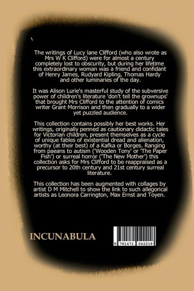 The writings of Lucy lane Clifford (who also wrote as Mrs W K Clifford) were for almost a century completely lost to obscurity, but during her lifetime this extraordinary woman was a friend and confidant of Henry James, Rudyard Kipling, Thomas Hardy and other luminaries of the day. It was Alison Lurie's masterful study of the subversive power of children's literature 'don't tell the grownups' that brought Mrs Clifford to the attention of comics writer Grant Morrison and then gradually to a wider yet puzzled audience. This collection contains possibly her best works. Her writings, originally penned as cautionary didactic tales for Victorian children, present themselves as a cycle of unique fables of existential dread and alienation, worthy (at their best) of a Kafka or Borges. Ranging from paeans to autism ('Wooden Tony' or 'The Paper Fish') or surreal horror ('The New Mother') this collection asks for Mrs Clifford to be reappraised as a precursor to 20th century and 21st century literature. This collection has been augmented with collages by artist D M Mitchell to show the link to such allegorical artists as Leonora Carrington, Max Ernst and Toyen.