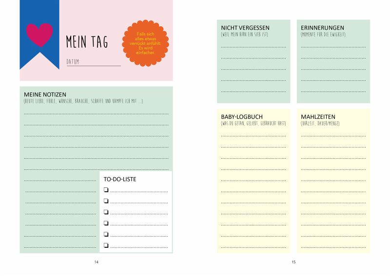 Amy Ransom, selbst dreifache Mutter, weiß um all die Sorgen und Fragen, die Mütter umtreiben können. Und dass manchmal ein Stück Kuchen das Einzige ist, was einen nach zwei Stunden Schlaf - mal wieder - rettet. Jeden Monat greift sie ein Thema heraus, das für diese Zeit relevant ist. 'The New Mum's Notebook' bietet mit individuell gestaltbaren Eintragseiten viel Platz für Gedanken, Gefühle und Erinnerungen. Es ist ein täglicher Begleiter, aufgeteilt in die ersten zwölf Monate der Mutterschaft, voll an Beruhigung, Liebe und Humor.
