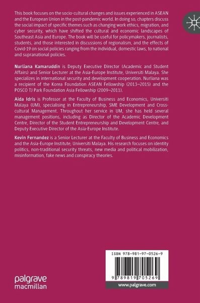 This book focuses on the socio-cultural changes and issues experienced in ASEAN and the European Union in the post-pandemic world. In doing so, chapters discuss the social impact of specific themes such as changing work ethics, migration, and cyber security, which have shifted the cultural and economic landscapes of Southeast Asia and Europe. The book will be useful for policymakers, journalists, students, and those interested in discussions of regionalism, and the effects of Covid-19 on social policies ranging from the individual, domestic laws, to national and supranational policies.
