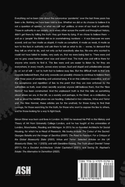 Everything we've been told about the coronavirus 'pandemic' over the last three years has been a lie. Nothing we have been told is true. Whether we did or do choose to believe it is not a question of opinion, or what we call 'our' politics, or even of our trust in authority. Those in authority in our society, as in every other across the world and throughout history, didn't get there by telling the truth: they got there by lying. If we chose to believe them - and as a 'people' the British did so in overwhelming numbers - it was because we were scared, and our fear made us stupid, it made us compliant, it made us weak, it made us turn to the liars in authority and ask them to tell us what to do - worse, to demand that they tell us what to do, and not only us but everybody else too. No-one who wanted to could not have failed to realise, very early on, that we were being lied to. There were and are no grey areas between what was and wasn't true. The truth was and still is there for anyone who wants to find it. The lies were and are easier to listen to, for they are everywhere, in every mouth, across every screen, loud and stupid and unbelievable except by an act of will - not to truth but to believe easy lies. But the difficult truth is that only cowards believed them, that only cowards can possibly choose to continue to believe them after three years of unrelenting and universal lying. It is on this collective cowardice, and on the acceptance and repetition of lies to the point that they are now enforced by the authorities as truth, even when secretly scarcely anyone still believes them, that the 'New Normal' has been constructed. And the unpleasant truth is that this tells us something about where we are, in the UK, as a society and perhaps, in the West, as a civilisation, as well as about the terrible place we are heading. Collected in two volumes, Virtue and Terror and The New Normal, these articles are for the unafraid, for those trying to find their courage, for those looking for the truth, for those who want to expose the lies to others, and for those looking for a way to fight back.