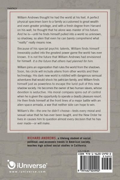 William Andrews thought he had the world at his feet. A perfect physical specimen born to a family accustomed to great wealth and even greater privilege, and with a fresh degree from Harvard on his wall, he thought that he alone was master of his future. And he is-until he finds himself pulled into a world so unknown, so shadowy, so alien that even he can barely comprehend what "reality" really means now. Because of his special psychic talents, William finds himself inexorably pulled into the greatest power game the world has ever known. It is not the future that William Andrews had envisioned for himself. It is the future that others had planned for him. William joins an organization that rules the world from the shadows. Soon, his circle will include aliens from other worlds and their technology. His dark new world is riddled with dangerous sensual adventures that would shock his patrician family, and William finds himself just as powerless to escape the lurid pull of this new shadow society. He becomes the owner of two human slaves, whose devotion is seductive. His moral compass spins out of control when he is given the opportunity to operate a deadly pleasure resort. He then finds himself at the front lines of a major battle with an alien space armada, a war that neither side can hope to win. William's life-the one he didn't choose-tests every moral and sexual value that he has ever been taught, and the New Order he lives in causes him to question almost every decision that he has ever made-or will make.
