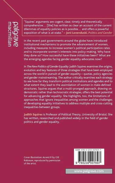 During the past decade governments around the globe have introduced institutional mechanisms to promote the advancement of women, including measures to increase women's political participation rates and to incorporate women's interests into policy-making. Why have they done so? How successful have these initiatives been? What are the emerging agendas facing gender equality advocates now? In the New Politics of Gender Equality Judith Squires examines the origins, evolution and key features of three strategies that have been employed across the world in pursuit of gender equality - quotas, policy agencies and gender mainstreaming. The author critically examines each strategy to see how far they transform political institutions and agendas and to what extent they lead rather to the assimilation of women in male-defined structures. Squires argues that a multi-pronged approach, drawing on democratic rather than technocratic strategies, offers the best potential for advancing gender equality. She highlights too the limitations of approaches that ignore inequalities among women and the challenges of developing equality initiatives to address multiple and cross-cutting inequalities between groups. Judith Squires is Professor of Political Theory, University of Bristol. She has written, researched and published widely in the field of gender politics and gender equality.