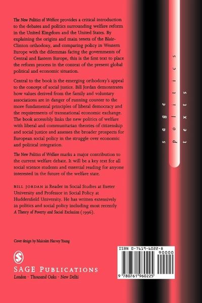 This critical and highly topical introduction to the current debates and politics surrounding welfare reform in the United Kingdom and the United States explains the origins and main tenets of the Blair-Clinton orthodoxy. Central to the book is an examination of this orthodoxy's appeal to the concept of social justice. Bill Jordan demonstrates how values derived from the family and voluntary associations are in danger of running counter to the more fundamental principles of liberal democracy and the requirements of transnational economic exchange. He links the new politics of welfare to liberal and communitarian theories of citizenship and social justice, and assesses the broader prospects for European social policy in the struggle over economic and political integration. `For more than a decade, Bill Jordan has been one of our most thoughtful and independent thinkers on the future of welfare. Anyone who wants to know more about what is happening to global welfare and why and how it should be changed should read this book' - Chris Pierson, Department of Politics, University of Nottingham