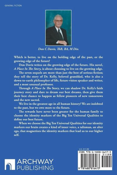 Which is better, to live on the holding edge of the past, or the growing edge of the future? Don Davis writes on the growing edge of the future. His novel, A Place In The Story, is about choosing to live on the growing edge. The seven sequels are more than just the best of serious fiction; they tell the story of Dr. Kelly, beloved granddad, who is also a down-to-earth philosopher of life, future-vision speaker and writer, and a most unusual professor. Through A Place In The Story, we can shadow Dr. Kelly’s faith journey story and dare to dream our best dreams, then give them their best chance to happen as fellow pioneers of new tomorrows and the new sacred. We live in the greatest age in all human history! We are indebted to the past, but we owe more to the future. The rewards have never been greater for the human family to choose the identity markers of the Big Ten Universal Qualities to define our best future. When we choose the Big Ten Universal Qualities for our identity markers our brain creates a kind of inner voice, a talisman, an alter ego, that magnetizes the identity markers that lead us to our higher self.