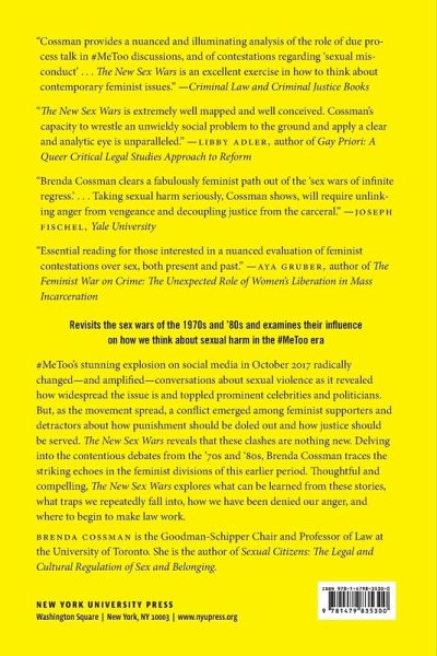 Revisits the sex wars of the 1970s and '80s and examines their influence on how we think about sexual harm in the #MeToo era #MeToo's stunning explosion on social media in October 2017 radically changed-and amplified-conversations about sexual violence as it revealed how widespread the issue is and toppled prominent celebrities and politicians. But, as the movement spread, a conflict emerged among feminist supporters and detractors about how punishment should be doled out and how justice should be served. The New Sex Wars reveals that these clashes are nothing new. Delving into the contentious debates from the '70s and '80s, Brenda Cossman traces the striking echoes in the feminist divisions of this earlier period. In exploring the history of past conflicts-the resistance to finding common ground, the media's pleasure in portraying the debates as polarized cat fights, the simplification of viewpoints as pro- and anti-sex-she shows how they have come to shape the #MeToo era. From the '70s to today, Cossman examines tensions between the need for recognition and protection under the law, and the colossal and ongoing failure of that law to redress historic injustice. By circumventing law altogether, #MeToo has led us to question whether justice can be served outside of the courtroom. Cossman argues for a different way forward-one based on reparative models that focus on shared desired outcomes and the willingness to understand the other side. Thoughtful and compelling, The New Sex Wars explores what can been learned from these stories, what traps we repeatedly fall into, how we have been denied our anger, and where to begin to make law work.