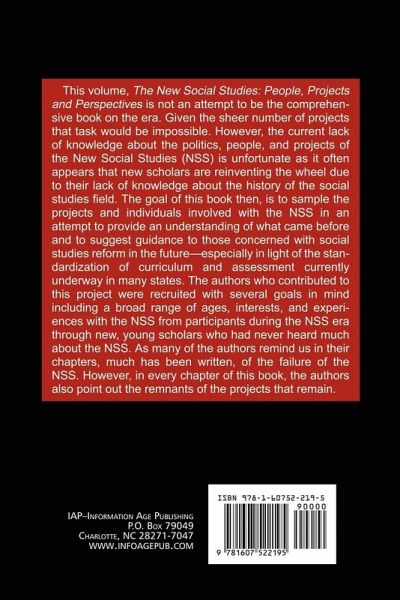 A volume in Studies in the History of Education Series Editor Karen L. Riley, Auburn University at Montgomery This volume, The New Social Studies: People, Projects and Perspectives is not an attempt to be the comprehensive book on the era. Given the sheer number of projects that task would be impossible. However, the current lack of knowledge about the politics, people and projects of the NSS is unfortunate as it often appears that new scholars are reinventing the wheel due to their lack of knowledge about the history of the social studies field. The goal of this book then, is to sample the projects and individuals involved with the New Social Studies (NSS) in an attempt to provide an understanding of what came before and to suggest guidance to those concerned with social studies reform in the future-especially in light of the standardization of curriculum and assessment currently underway in many states. The authors who contributed to this project were recruited with several goals in mind including a broad range of ages, interests and experiences with the NSS from participants during the NSS era through new, young scholars who had never heard much about the NSS. As many of the authors remind us in their chapters, much has been written, of the failure of the NSS. However, in every chapter of this book, the authors also point out the remnants of the projects that remain. Chapters in this book include: National Security Trumps Social Progress: The Era of the New Social Studies in Retrospect by Ronald W. Evans; Hilda Taba: Social Studies Reform from the Bottom Up by Barbara Slater Stern; Fannie Shaftel and Her New Social Studies by Jane Bernard- Powers; Can You Still Catch Fish with New Social Studies Bait? Ted Fenton and the Carnegie-Mellon (Social Studies) Project by Michelle D. Cude; "The Quest for Relevancy": Allan Kownslar and Historical Inquiry in the New Social Studies Movement by Elizabeth Yeager Washington and Robert L. Dahlgren; Leader-Writers: The Contributions of Donald Oliver, Fred Newmann and James Shaver to the Harvard Social Studies Project by Chara Haeussler Bohan and Joseph R. Feinberg; Harold Berlak and the Metropolitan St. Louis Social Studies Project: Cultivating Social Studies at Local Level by Carol Klages; A Red Headed Stepchild of Social Reconstruction: Sociology and the New Social Studies by Karen L. Riley; Geography and the New Social Studies: The High School Geography Project and the Georgia Geography Curriculum Project by Joseph P. Stoltman; Economics and the New Social Studies by Beverly J. Armento; Anthropology and the Anthropology Projects, Long Ago in a Galaxy Far Away by Murry Nelson; Making Sense of It All: A Research Synthesis on the Impact of Man: A Course of Study by Chrystal S. Johnson; American Political Behavior: The Project and the People by Carole E. Hahn; Small Projects of the New Social Studies (Bring Back the Best) by John D. Hoge; The Fight over MACOS by Larry Kraus; The "History Problem" in Curricular Reform: A Warning to Constructivists from the New Social Studies Movement by Geoffrey Scheurman and Keith Reynolds; We Won't Get Fooled Again; Will We?? Teacher Perceptions of the New Social Studies by Mark A. Previte; The New Social Studies and the Ethos of Multiculturalism by Gloria Contreras; Lies and History: Unmasking Academic Complacency by David Warren Saxe; The Wisdom of Experience and Practice by Mary E. Haas; Inquiry Teaching and Learning: Is there, was there, a Cutting Edge in Social Studies? Or, My Life as an 'Inquiry' Social Studies Teacher by Jack Zevin; and Leveraging Technology for Student Inquiry: Technology in the New Social Studies and Today by Meghan McGlinn Manfra.