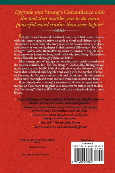 Get more mileage out of your Strong's Concordance with this English Word Index Every one of the millions of users of Strong's Exhaustive Concordance can now multiply its usefulness and benefit from the exclusive English Word Index created by Thomas Nelson. A convenient addition to Bible study resources for pastors, scholars, students, and those who want to dig deeper in their personal Bible study, this index offers an easy-to-use format for doing word studies more efficiently and completely. The New Strong's(R) Guide to Bible Words helps you get the full benefit of your current Bible study resources-giving you access to over 14,000 biblical words, showing all Hebrew or Greek words that lie behind each English word, along with the number of times each occurs, Strong's numbers, and brief definitions. If you own a Strong's Concordance, you'll want the New Strong's(R) Guide to Bible Words. If you want to do serious word studies, you won't want to be without this valuable tool.