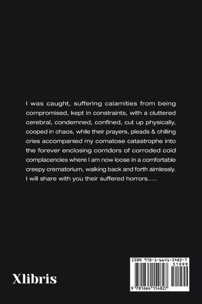 I was caught, suffering calamities from being compromised, kept in contraints, with a cluttered cerebral, condemned, confined, cut up physically, cooped in chaos, while their prayers, pleads & chilling cries accompanied my comatose catastrophe into the forever enclosing corridors of corroded cold complacencies where I am now loose in a comfortable creepy crematorium, walking back and forth aimlessly. I will share with you their suffered horrors.....