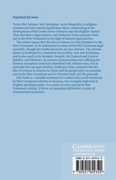 Terms like 'witness' and 'testimony' occur frequently in religious contexts and have special significance there, culminating in the development of the Greek martus (witness) into the English 'martyr'. They also have a legal context, and Professor Trites examines their use in the New Testament in the light of ancient legal practice. The author argues that the idea of witness is a live metaphor in the New Testament, to be understood in terms of the Old Testament legal assembly, though the Greek lawcourts are also relevant. The witness theme is developed in a sustained way in John, Acts and Revelation, and is also used in the Synoptic Gospels, the Pastoral and General Epistles, and Hebrews. In contexts of persecution and suffering the forensic metaphors tend to be identified with military ones, but in principle they are quite distinct. Professor Trites contends that the idea of witness in relation to Christ and his gospel plays an essential part in the New Testament and in Christian faith and life generally.