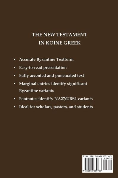 The Byzantine Majority Text as compiled by MAURICE A. ROBINSON and WILLIAM G. PIERPONTLarge print - easy to read Important information for the study of New Testament textual criticism Includes accents and punctuation marks Accurate Byzantine Textform Easy-to-read presentation Fully accented and punctuated text Marginal entries identify significant Byzantine variants Footnotes identify NA27/UBS4 variants Ideal for scholars, pastors, and students
