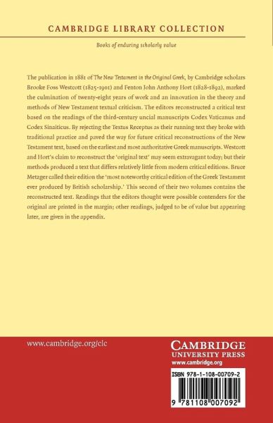 The publication in 1881 of The New Testament in the Original Greek, by the Cambridge scholars Brooke Foss Westcott (1825-1901) and Fenton John Anthony Hort (1828-1892), marked the culmination of twenty-eight years of work and revolutionised the theory and methods of New Testament textual criticism. The editors broke with tradition and reconstructed a critical text based on the third-century uncial manuscripts Codex Vaticanus and Codex Sinaiticus, paving the way for future editions. Westcott and Hort's claim to reconstruct the 'original text' may seem extravagant today; but according to Bruce Metzger theirs was the 'most noteworthy critical edition of the Greek Testament ever produced by British scholarship'. This second volume contains the reconstructed text. Readings that the editors thought were possible contenders for the original are printed in the margin; other readings, judged to be of value but appearing later, are given in the appendix.