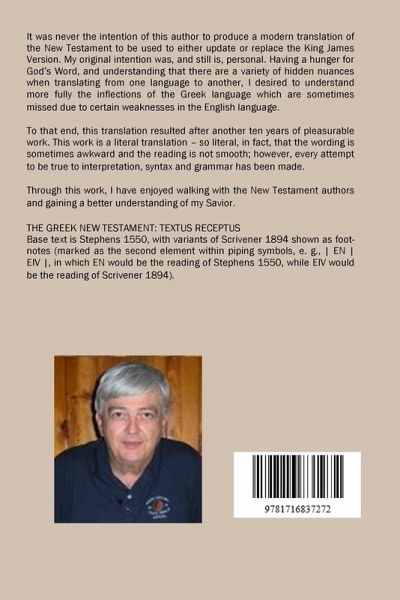 It was never the intention of this author to produce a modern translation of the New Testament to be used to either update or replace the King James Version. My original intention was personal. Having a hunger for God's Word, and understanding that there are a variety of hidden nuances when translating from one language to another, I desired to understand more fully the inflections of the Greek language which are sometimes missed due to certain weaknesses in the English language. This is the second time I have translated the New Testament from the Greek. My first exercise was from a Critical Text (CT) - known as the Nestle-Aland edition after its most influential editors, Eberhard Nestle and Kurt Aland. At the time of this writing, there have been twenty-eight edition/revisions of this text. Having completed that translation work, I found several issues that caused me some concern. I was so moved that I destroyed my first efforts, which represented nearly ten years of work. While modern scholars will defend the CT as being older and "more reliable," more recent scholarship would place the Textus Receptus (TR) as having its origin within a few years of the close of the Canon traced through the Peshitta text. Modern scholars would also suggest that there are no major doctrines of the Christian faith which cannot be found in the CT; however, when those major doctrines appear clearly and obviously, why use a text that shrouds these doctrines from plain view. To that end, this translation resulted after another ten years of pleasurable work. This work is a literal translation - so literal, in fact, that the wording is sometimes awkward and the reading is not smooth; however, every attempt to be true to interpretation, syntax and grammar has been made. Through this work, I have enjoyed walking with the New Testament authors and gaining a better understanding of my Savior.
