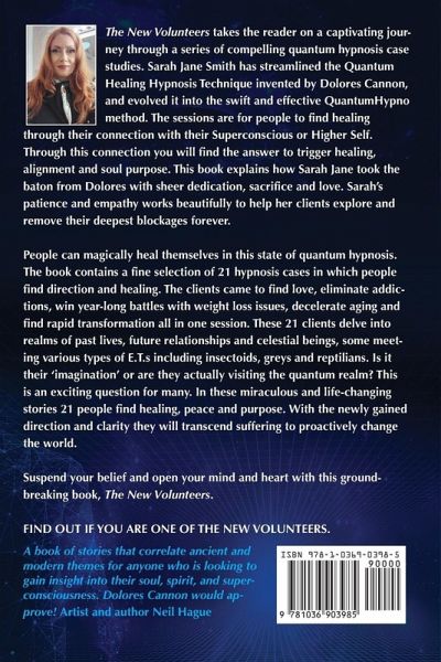 'The New Volunteers' takes the reader on a captivating journey through a series of compelling quantum hypnosis case studies. Sarah Jane Smith has streamlined the Quantum Healing Hypnosis Technique invented by Dolores Cannon, and evolved it into the swift and effective QuantumHypno method. The sessions are for people to find healing through their connection with their Superconscious or Higher Self. Through this connection you will find the answer to trigger healing, alignment and soul purpose. This book explains how Sarah Jane took the baton from Dolores with sheer dedication, sacrifice and love. Sarah's patience and empathy works beautifully to help her clients explore and remove their deepest blockages forever. People can magically heal themselves in this state of quantum hypnosis. The book contains a fine selection of 21 hypnosis cases in which people find direction and healing. The clients came to find love, eliminate addictions, win year-long battles with weight loss issues, decelerate aging and find rapid transformation all in one session. These 21 clients delve into realms of past lives, future relationships and celestial beings, some meeting various types of E.T.s including insectoids, greys and reptilians. Is it their 'imagination' or are they actually visiting the quantum realm? This is an exciting question for many. In these miraculous and life-changing 21 people find healing, peace and purpose. With the newly gained direction and clarity they will transcend suffering to proactively change the world. Suspend your beliefs and open your mind and heart with this ground-breaking book, 'The New Volunteers'. FIND OUT IF YOU ARE ONE OF THE NEW VOLUNTEERS.