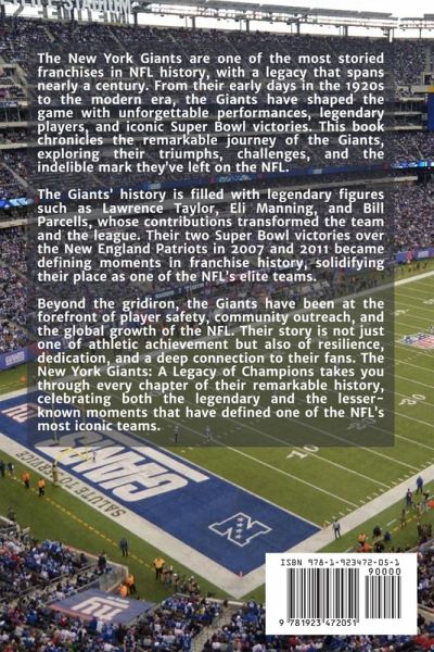 The New York Giants are one of the most storied franchises in NFL history, with a legacy that spans nearly a century. From their early days in the 1920s to the modern era, the Giants have shaped the game with unforgettable performances, legendary players, and iconic Super Bowl victories. This book chronicles the remarkable journey of the Giants, exploring their triumphs, challenges, and the indelible mark they've left on the NFL. The Giants' history is filled with legendary figures such as Lawrence Taylor, Eli Manning, and Bill Parcells, whose contributions transformed the team and the league. Their two Super Bowl victories over the New England Patriots in 2007 and 2011 became defining moments in franchise history, solidifying their place as one of the NFL's elite teams. Beyond the gridiron, the Giants have been at the forefront of player safety, community outreach, and the global growth of the NFL. Their story is not just one of athletic achievement but also of resilience, dedication, and a deep connection to their fans. The New York Giants: A Legacy of Champions takes you through every chapter of their remarkable history, celebrating both the legendary and the lesser-known moments that have defined one of the NFL's most iconic teams.