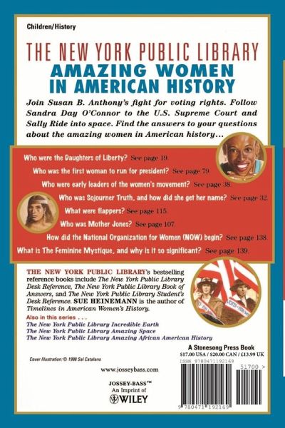 The New York Public Library amazing women in American History Join Susan B. Anthony's fight for voting rights. Follow Sandra Day O'Connor to the U.S. Supreme Court and Sally Ride into space. Find the answers to your questions about the amazing women in American history... Who were the Daughters of Liberty? See page 19. Who was the first woman to run for president? See page 79. Who were early leaders of the women's movement? See page 38. Who was Sojourner Truth, and how did she get her name? See page 32. What were flappers? See page 115. Who was Mother Jones? See page 107. How did the National Organization for Women (NOW) begin? See page 138. What is The Feminine Mystique, and why is it so significant? See page 139. Also in this series . . . * The New York Public Library Incredible Earth * The New York Public Library Amazing Space * The New York Public Library Amazing African American History