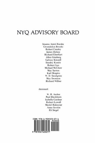 Since its founding in 1969 by William Packard, The New York Quarterly has been devoted to excellence in the publication of a unique and fervent cross-section of contemporary American poetry regardless of school of thought, style, or genre. Our only concern is to focus on the craft that underlies effective poetry writing. The New York Quarterly features works by both known and emerging poets. The NYQ Craft Interviews present the views of some of our most outstanding poets on the general subjects of style, prosody and technique. The issues are rounded out with an essay or two on the subject of contemporary American poetry that is both accessible and meaningful to readers, poets, students, and teachers of poetry alike. NYQ 27 features a craft interview with Charles Bukowski, an editorial on contemporary poetry (III), an essay by Karl Shapiro, and poetry by James Dickey, W. D. Snodgrass, Imamu Amiri Baraka, Charles Bukowski, Richard Eberhart, Ruth Herschberger, Leo Connellan, Lola Haskins, Stephen Stepanchev, Al Santoli, Wing Tek Lum, Daniel Berrigan, Constance Carrier, Bryanne Nanfito, Andrew Glaze, William Stafford, Robert Lax, May Sarton, Andy Clausen, David Cope, Chris Brown, Steve Kowit, William Durham, Dennis Bernstein, Joan Shapiro, Pat Smuklo, William Packard, Carol Purdy, Patricia O'Callaghan, Stephen Lupack, Donald Lev, James McGlynn, Andrew Harvey, and Ron Adams.