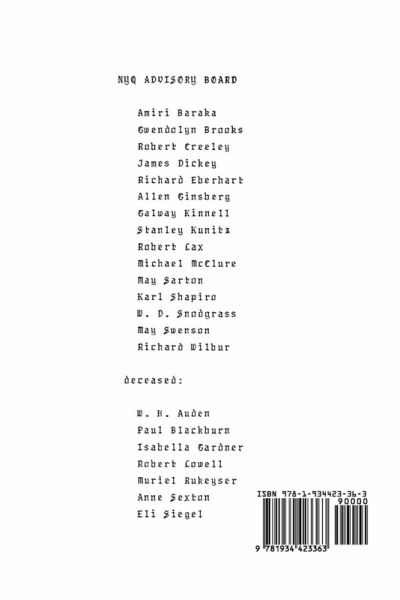 Since its founding in 1969 by William Packard, The New York Quarterly has been devoted to excellence in the publication of a unique and fervent cross-section of contemporary American poetry regardless of school of thought, style, or genre. Our only concern is to focus on the craft that underlies effective poetry writing. The New York Quarterly features works by both known and emerging poets. The NYQ Craft Interviews present the views of some of our most outstanding poets on the general subjects of style, prosody and technique. The issues are rounded out with an essay or two on the subject of contemporary American poetry that is both accessible and meaningful to readers, poets, students, and teachers of poetry alike. NYQ 36 features a craft interview with Macdonald Carey, an editorial on writing as process, an essay by Will Inman, and poetry by Macdonald Carey, Charles Bukowski, Antler, Michael Moriarty, Thomas McGrath, Jane Mayhall, Anna Adams, B. D. Trail, Lyn Lifshin, Victoria McCabe, Richard Kostelanetz, Michele Ingram, Jean Balderston, Kay Murphy, Roy Barrows, Doyle Wesley Walls, Catherine Brewton, Wanda Coleman, Kelly Cherry, June Collins, Alan Catlin, Jim Daniels, Mark DeFoe, Antonio de Nicolas, Carol Dunne, Frank Finale, Andrew Harvey, Jalaine Halsall, Anne Katcher, J. Kates, Robert Libbey, David Lawson, Anne-Marie Levine, Hale Chatfield, William Packard, Jared Smith, M. Z. Ribalow, Reena Ribalow, Sanford Fraser, John Urbain, and Will Inman.