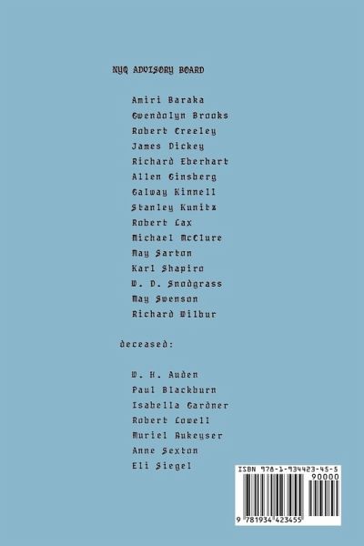 Since its founding in 1969 by William Packard, The New York Quarterly has been devoted to excellence in the publication of a unique and fervent cross-section of contemporary American poetry regardless of school of thought, style, or genre. Our only concern is to focus on the craft that underlies effective poetry writing. The New York Quarterly features works by both known and emerging poets. The NYQ Craft Interviews present the views of some of our most outstanding poets on the general subjects of style, prosody and technique. The issues are rounded out with an essay or two on the subject of contemporary American poetry that is both accessible and meaningful to readers, poets, students, and teachers of poetry alike. NYQ 45 features a craft interview with Betty Comden, an editorial about NYQ screening, an essay by Laurel Blossom, and poetry by Charles Bukowski, Karl Shapiro, Leo Connellan, Franz Douskey, Colette Inez, Ethan Gilsdorf, Lyn Lifshin, Anna Adams, Antler, Judson Crews, James Broughton, Linda Tieber, Harold Witt, Andrew Glaze, Will Inman, Donald Lev, Simon Perchik, Knute Skinner, Jeff Poniewaz, Michael Moriarty, Sanford Fraser, Robert Funge, Dion Birney, Gay Brewer, John Couturier, Michael Atkinson, William Packard, Robin Renee, Samel Maio, Roy Ricci, Alison Stone, Serena Siegfried, Nancy Shiffrin, R. L. Tyler, John Urbain, Joel Zeltzer, Joan Seliger Sidney, Terri Brown-Davidson, Ann Chernow, Nancy Deisroth, Ann Knox, David Gelsanliter, Dan Lenihan, Victoria McCabe, Stuart McCarrell, Kay Murphy, Edmund Pennant, David James, and Lisa Palma.