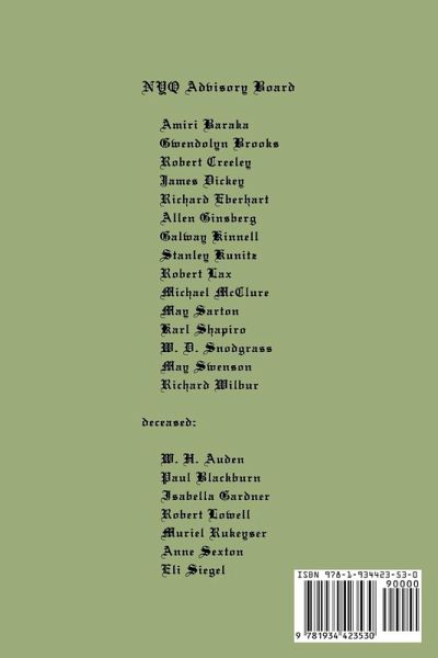 Since its founding in 1969 by William Packard, The New York Quarterly has been devoted to excellence in the publication of a unique and fervent cross-section of contemporary American poetry regardless of school of thought, style, or genre. Our only concern is to focus on the craft that underlies effective poetry writing. The New York Quarterly features works by both known and emerging poets. The NYQ Craft Interviews present the views of some of our most outstanding poets on the general subjects of style, prosody and technique. The issues are rounded out with an essay or two on the subject of contemporary American poetry that is both accessible and meaningful to readers, poets, students, and teachers of poetry alike. NYQ 53 features a craft interview with May Sarton, an editorial on women (part 2), and poetry by Karl Shapiro, Charles Bukowski, Michael Moriarty, Lyn Lifshin, James Laughlin, Colette Inez, Michael Benedikt, Antler, Lola Haskins, Edmund Pennant, Richard Kostelanetz, Anna Adams, Lewis Turco, Harold Witt, Gina Bergamino, Ethan Gilsdorf, Patricia Covey, Norman Stock, Daniel Zimmerman, Elisavietta Ritchie, David Levine, David Lawson, Dan Memmolo, Charles O'Hay, Carol Purdy, Kristan Bock, Luke Anthony, John Sokol, Suzanne A. Solomon, Beaird Glover, Jack Shadoian, Rodney Torreson, Bethany Saltman, Becca Hensley, Barbara Weisberg, M. C. Watson, Alison Stone, Tony Gloeggler, David Wolf, Linda Young, Victoria McCabe, Alice Anderson, Ben Anderson, Tony Quagliano, Christine Hall, Mark Reynolds, J. G. Brister, Michael Estabrook, Jackie Gavron, William Packard, Jennifer Drake, Margaret Gilbert, Thomas Heise, Tom Rockwell, Nicolas Baert, Carolyn Slapikas, and Jean Balderston.