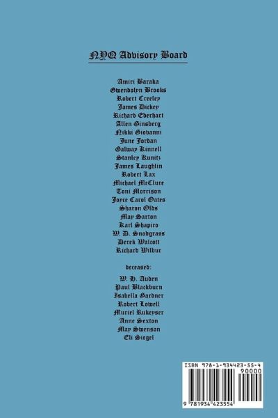 Since its founding in 1969 by William Packard, The New York Quarterly has been devoted to excellence in the publication of a unique and fervent cross-section of contemporary American poetry regardless of school of thought, style, or genre. Our only concern is to focus on the craft that underlies effective poetry writing. The New York Quarterly features works by both known and emerging poets. The NYQ Craft Interviews present the views of some of our most outstanding poets on the general subjects of style, prosody and technique. The issues are rounded out with an essay or two on the subject of contemporary American poetry that is both accessible and meaningful to readers, poets, students, and teachers of poetry alike. NYQ 55 features a craft interview with Michael McClure; an editorial on poetry and vision; an essay, "Shrink-Rapt Poetry?" by Dean Blehert; and poetry by Charles Bukowski, Paul Trachtenberg, Robert Peters, Gerald Nicosia, James Broughton, Andrew Glaze, Lyn Lifshin, Stephen Stepanchev, Antler, Anna Adams, Franz Douskey, Patricia Farewell, William Packard, Tom Rockwell, Carolyn Slapikas, T. Kilgore Splake, Amy Fusselman, Sanford Fraser, Herb Kitson, Gina Bergamino, Elizabeth Montalbano, Timothy Monaghan, Joshua McKinney, Stephanie Hager, Stephen Ajay, Jill Barnes, Bill Buege, Christopher Brown, Bill Shields, Dean Blehert, Patricia Covey, Stephanie Dickinson, Emanuel Di Pasquale, Lisa Verigin, Charles Webb, Anne Marie Dunatov, and Paul Agostino.