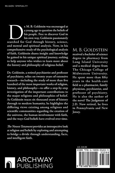 Dr. M. B. Goldstein was encouraged at a young age to question the beliefs of his people. Free to discover God in his own way, Goldstein passionately searched for God through history, science, and mental and spiritual analysis. Now, in his comprehensive study of the psychological analysis of faith, Goldstein shares insight and knowledge he gained in his unique spiritual journey, seeking to help anyone who wishes to learn more about the history and philosophy of religious belief. Dr. Goldstein, a retired psychiatrist and professor of psychiatry, relies on twenty years of extensive research-including the study of more than five hundred of the most important works of religion, history, and philosophy-to offer a step-by-step investigation of the important contributions to the major religions and philosophies of belief. As Goldstein traces six thousand years of history through to modern humanity, he highlights the differing views existing among religious and scientific communities regarding the creation of the universe, the human involvement with faith, and the ways God beliefs have evolved over time. The Newest Testament provides an introspective look at religion and beliefs by exploring and attempting to bridge a divide through understanding, facts, and intelligent faith.