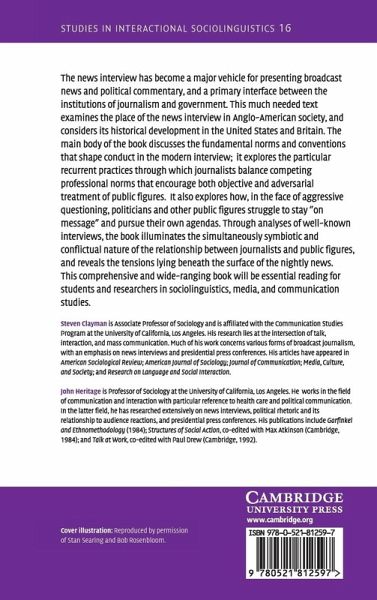 The news interview has become a major vehicle for presenting broadcast news and political commentary, and a primary interface between the institutions of journalism and government. This much-needed work examines the place of the news interview in Anglo-American society and considers its historical development in the United States and Britain. The main body of the book discusses the fundamental norms and conventions that shape conduct in the modern interview. It explores the particular recurrent practices through which journalists balance competing professional norms that encourage both objective and adversarial treatment of public figures. Through analyses of well-known interviews, the book explores the relationship between journalists and public figures and also how, in the face of aggressive questioning, politicians and other public figures struggle to stay 'on message' and pursue their own agendas. This comprehensive and wide-ranging book will be essential reading for students and researchers in sociolinguistics, media and communication studies.