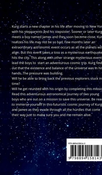 Kurg starts a new chapter in his life after moving to New York with his stepparents and his stepsister. Sooner or later Kurg meets a boy named James and they soon become close. Kurg realizes his life may not be so bad. Few months later an extraordinary astronomic event occurs as all the planets will align. But this event takes a toss as a mysterious earthquake hits the city. This along with other strange mysterious events lead the boys to start an adventurous cosmic trip. Kurg finds out that the existence and balance of the universe was in his hands. The pressure was building. Will he be able to bring back the previous explorers stuck in time? Will he get reunited with his origin by completing this mission? Read this adventurous astronomical journey of two young boys who are out on a mission to save this universe. Be ready to immerse yourself in this futuristic cosmic journey of Kurg and James as they evade through all the hurdles that come their way just to make sure you and I remain alive.