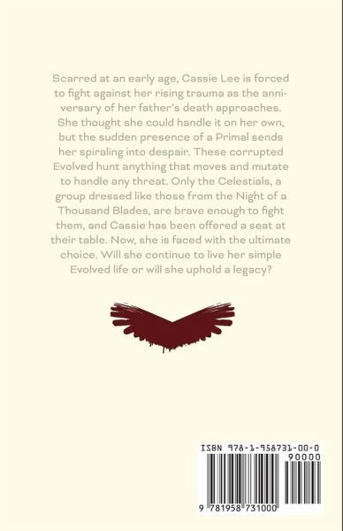 Scarred at an early age, Cassie Lee is forced to fight against her rising trauma as the anniversary of her father's death approaches. She thought she could handle it on her own, but the sudden presence of a Primal sends her spiraling into despair. These corrupted Evolved hunt anything that moves and mutate to handle any threat. Only the Celestials, a group dressed like those from the Night of a Thousand Blades, are brave enough to fight them, and Cassie has been offered a seat at their table. Now, she is faced with the ultimate choice. Will she continue to live her simple Evolved life or will she continue a legacy?