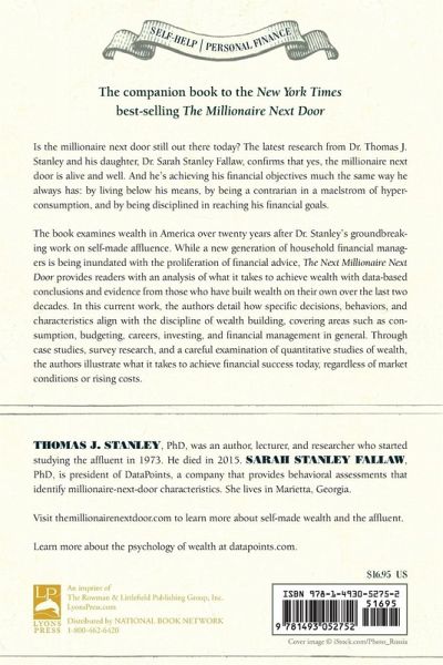 Is the millionaire next door still out there today? The latest research from Dr. Thomas J. Stanley and his daughter, Dr. Sarah Stanley Fallaw, confirms that, yes, the millionaire next door is alive and well. And he's achieving his financial objectives much the same way he always has: by living below his means, being a contrarian in a maelstrom of hyper-consumption, and being disciplined in reaching his financial goals. The book examines wealth in America 20 years after Dr. Stanley's groundbreaking workon self-made affluence. While a new generation of household financial managers are being inundated with the proliferation financial advice, The Next Millionaire Next Door provides readers with an analysis of what it takes to achieve wealth with data-based conclusions and evidence from those who have built wealth on their own over the last two decades. In this current work, the authors detail how specific decisions, behaviors, and characteristics align with the discipline of wealth building, covering areas such as consumption, budgeting, careers, investing, and financial management in general. Through case studies, survey research, and a careful examination of quantitative studies of wealth, the authors illustrate what it takes to achieve financial success today, regardless of market conditions or rising costs.