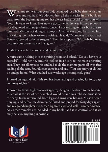 When my son was four years old, he prayed for a baby sister with blue eyes and red hair. We adopted her; all the miracles in this book are true. From the beginning, my son has always had a special connection with God. He talks to Him. He's now a doctor when he was in med school. I was diagnosed with stage 4 breast cancer. I was waiting to have both breasts removed. My son was doing an autopsy. After he was done, he rushed into the waiting room where we were waiting. He said, "Mom, why are you here? You're supposed to be in surgery." Then he stopped. "It's probably okay because your breast cancer is all gone." I didn't believe him as usual, and he said, "Stop it." A nurse came rushing into the waiting room and asked, "Do you have your records?" I told her no, and she took us in a hurry to the main operating area. They lost all my records and had to do the mammograms all over after reading all the tests. Four doctors came in and said, "You can put your clothes on and go home. What you had two weeks ago is completely gone" I started crying and said, "My son has been fasting and praying for forty days and forty nights." I moved to Texas. Eighteen years ago, my daughter has been to the hospital to see what the sex of her new child would be and was told she must abort the baby. In the ultrasound, both legs and arms were broken. My son began praying, and before the delivery, he fasted and prayed for forty days again, and my granddaughter just turned eighteen alive and well--another miracle. Any other miracles are included in my book. God is in control, and if we truly believe, anything is possible.